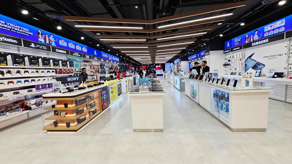 تجربة رقمية غامرة: شاشات تفاعلية، إضاءة حديثة، وتصاميم تجعل المتجر أشبه بمعرض تقني مستقبلي.
